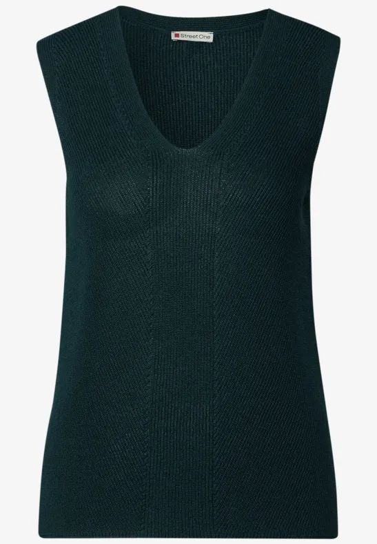 Dieses Stricktop von Street One für Damen überzeugt mit seiner modernen Strickstruktur und einem femininen V-Ausschnitt. Der angenehme Viskosemix sorgt für ein weiches Tragegefühl und macht den ärmellosen zum perfekten Layering-Partner.